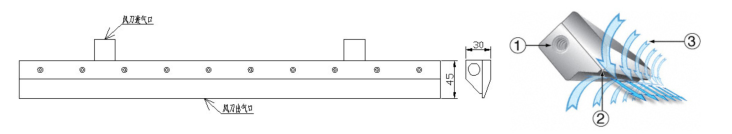 压缩空气①进入风刀(气刀)后,通过风刀(气刀)出口的宽度仅为0.05-0.1毫米间,可供选择的间隙②吹出,从而形成一个高速的气流薄片,有效距离可达1.5m。通过科恩达效应原理及风刀特殊的构造,此薄片气幕将引流30到40倍的环境空气